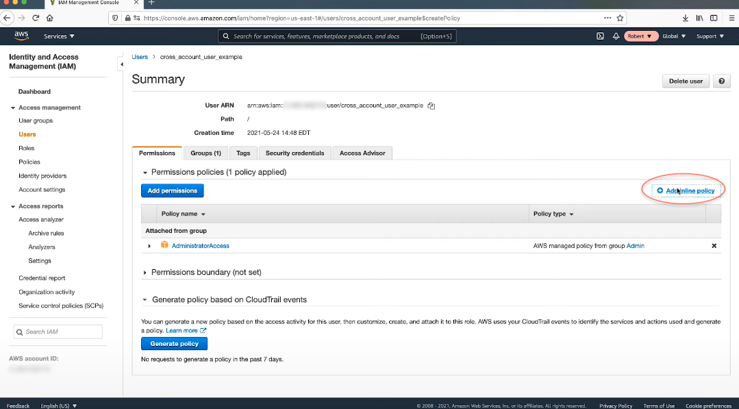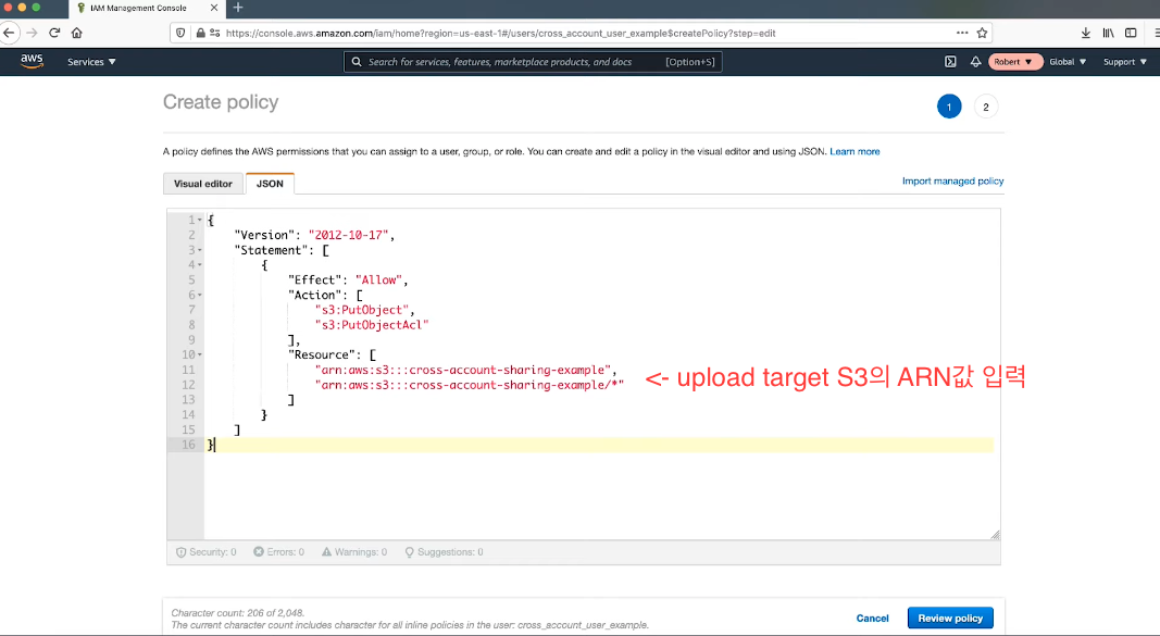 아래 policy 붙여넣으며, 이때 Principal의 값으로는 계정 A에 있는 IAM 사용자의 ARN을 입력해야한다!