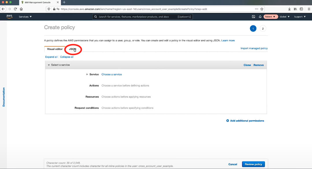 Add inline policy버튼 클릭 및Json탭 이동