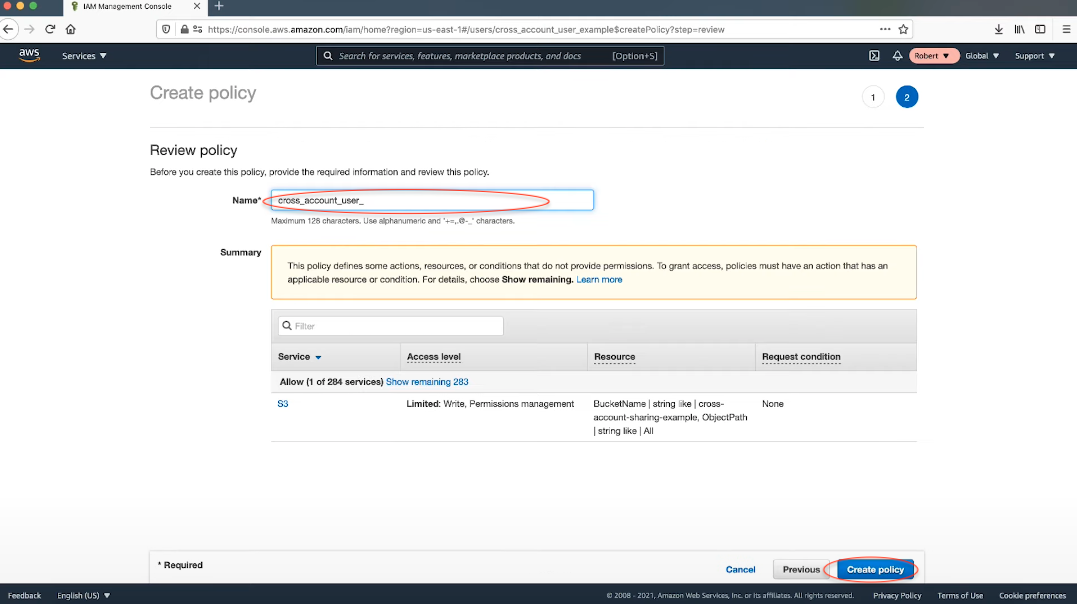 { "Version": "2012-10-17", "Statement": [ { "Effect": "Allow", "Action": [ "s3:PutObject", "s3:PutObjectAcl" ], "Resource": [ "arn:aws:s3:::DOC-EXAMPLE-BUCKET", # target s3 bucket ARN "arn:aws:s3:::DOC-EXAMPLE-BUCKET/*" ] } ] } - Step 6 : 코드로 새롭게 추가한 정책명 입력 및 생성