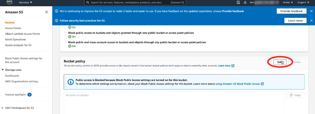 [A]의 IAM 계정에 정책 추가가 완료되었다면, [A]가 접근할, S3 버킷에 [A계정]에서 설정했던 정책에 대한 추가가 필요하다.