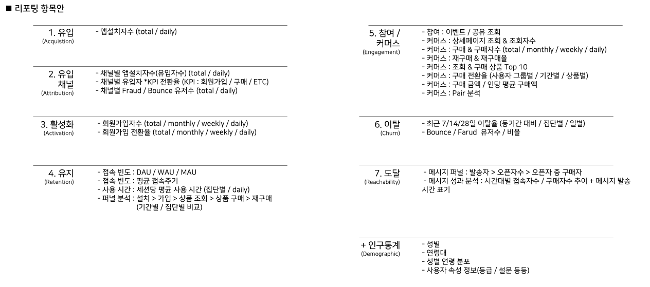 - 퍼널 분석 : 설치 > 가입 > 상품 조회 > 상품 구매 > 재구매
