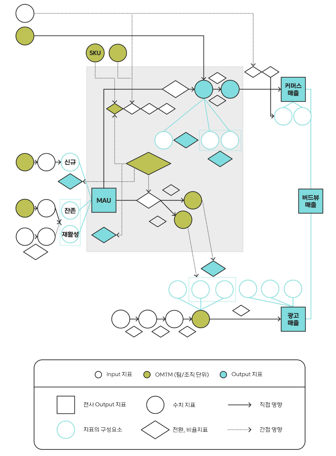 : 그러나 문제를 잘 정의하려면 여전히 분석가와 함께 논의를 해야 하는 어려움이 남아있었음. 때문에 분석가 없이도 가장 중요한 지표에 집중할 수 있도록 전사에서 다루는 중요한 인풋 지표와 아웃풋 지표 간의 관계를 표현한 관계도를 제작·공유함.