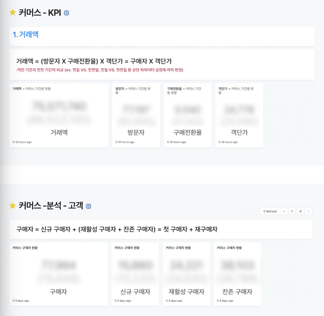 : 지표 관계를 잘 이해하게 되었다면, 다음은 그 흐름에 따라 지표의 현재 수준을 확인할 수 있는 환경이 필요하였으며, 분석 흐름을 따라가면서 지표들을 탐색할 수 있도록 대시보드 설계하였음. 대시보드를 활용해 분석가가 아닌 구성원들도 중요한 지표 변동과 원인을 파악하는 분석 정도는 스스로, 그리고 빠르게 할 수 있어야 함.
