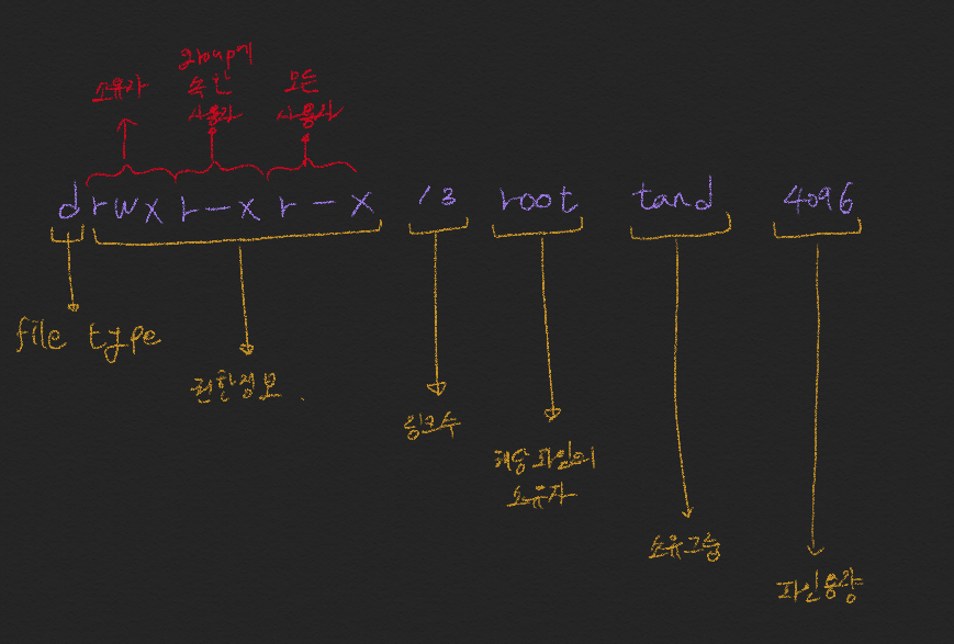 : 우선 파일 및 폴더의 권한을 읽는 방법 부터 샅펴보자. ls -all명령어를 사용하면 아래와 같이 파일들의 권한과 정보를 확인 할 수 있다.
