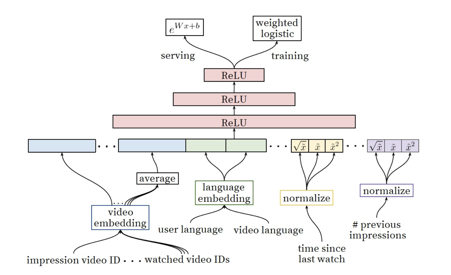 : 이 글은 딥러닝을 활용한 드라마틱한 성능의 추천 시스템에 대한 논문이다. 해당 방식은 2가지로 나뉘게 되는데, 첫번째는 ‘후보생성 모델(deep candidate generation model)’이며, 두번째는 ‘랭킹 모델(deep ranking model)’이다. (필자는 현재 주어진 컨텐츠에 대해서 누가 높은 레이팅을 줄 것인지만 다루고 있기에 두가지 모델중 랭킹 모델에 관련된 컨텐츠만을 읽었다…)