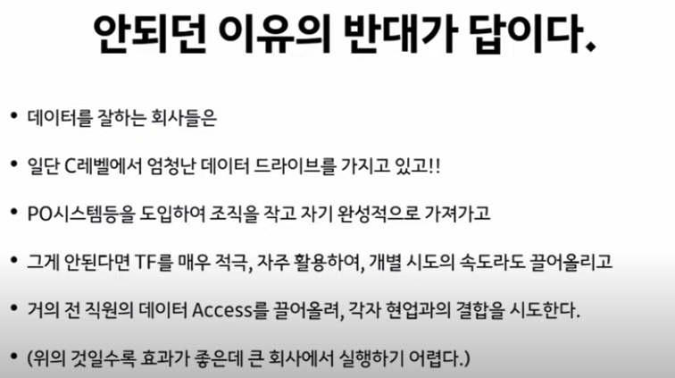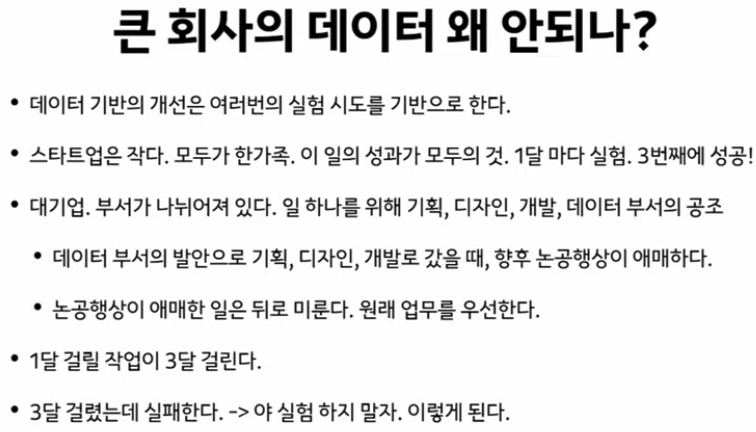 - 모든 데이터를 다 축적하려는 기업이 많음. 그러나, 완벽한 모든 데이터 구축은 오랜 시간이 걸리며, 불가능함.