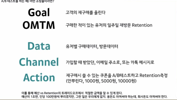 - 채널 : 고객에게 가치를 전달할 수단(ex. push 메세지, 광고 배너 등)