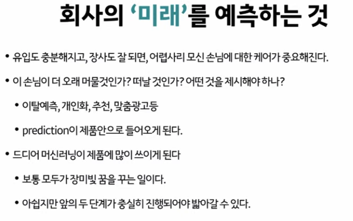 - 데이터 : 우리만 가지고 있는 배타적 데이터(ex. 고객 로그 데이터)
