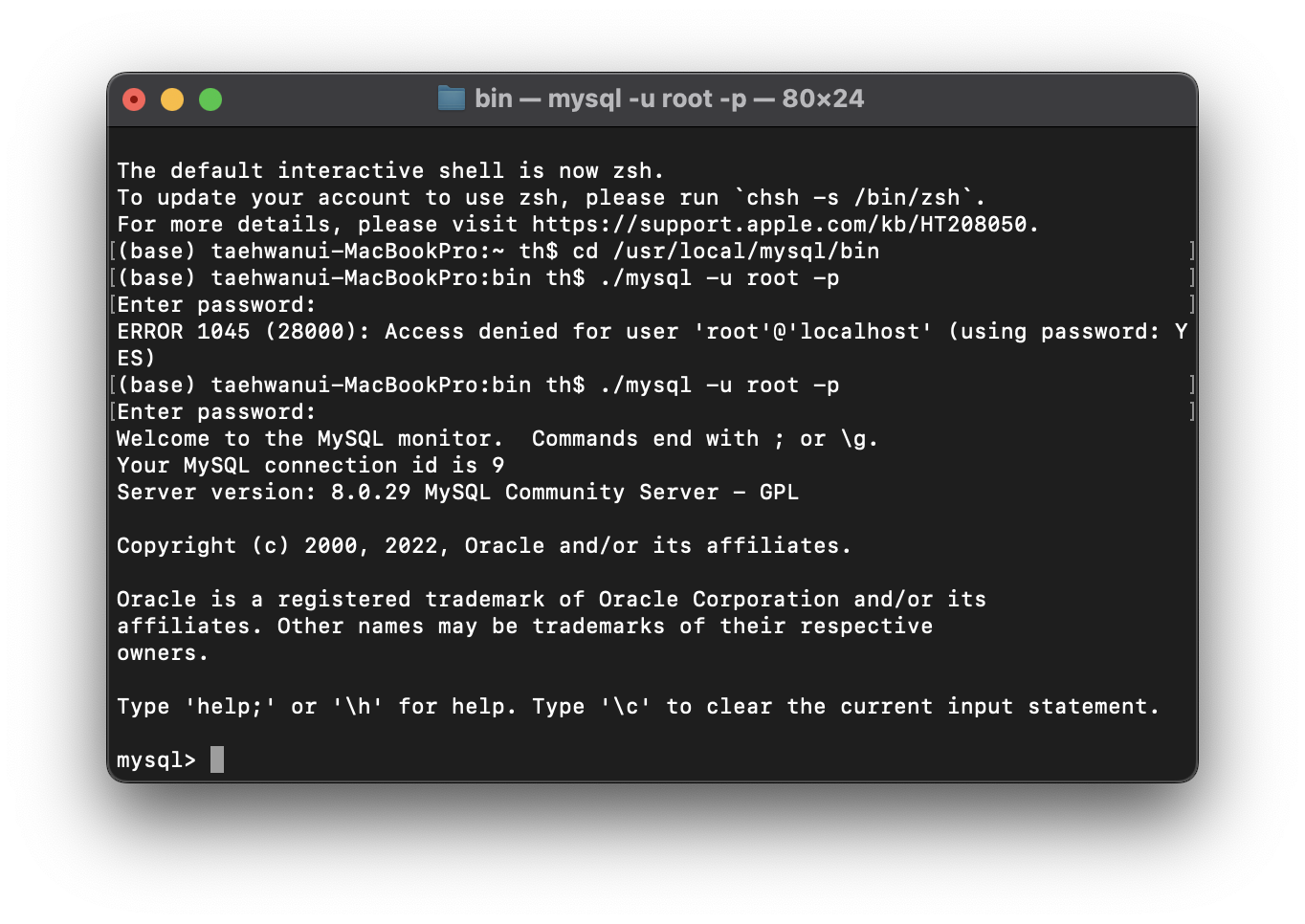 ./mysql -u root -p ## -u : 유저명, -p : 인증방식 Password (dbs1)