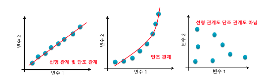 : 앞선 pearson의 상관관계는 선형관계만을 표현 할 수 있을 뿐, 두 변수간의 관계가 곡선일 경우 Pearson의 상관관계는 이를 표현하지 못하게 되므로 관계성만을 표현해주는 Spearman 또는 Kendall의 단조관계 필요.