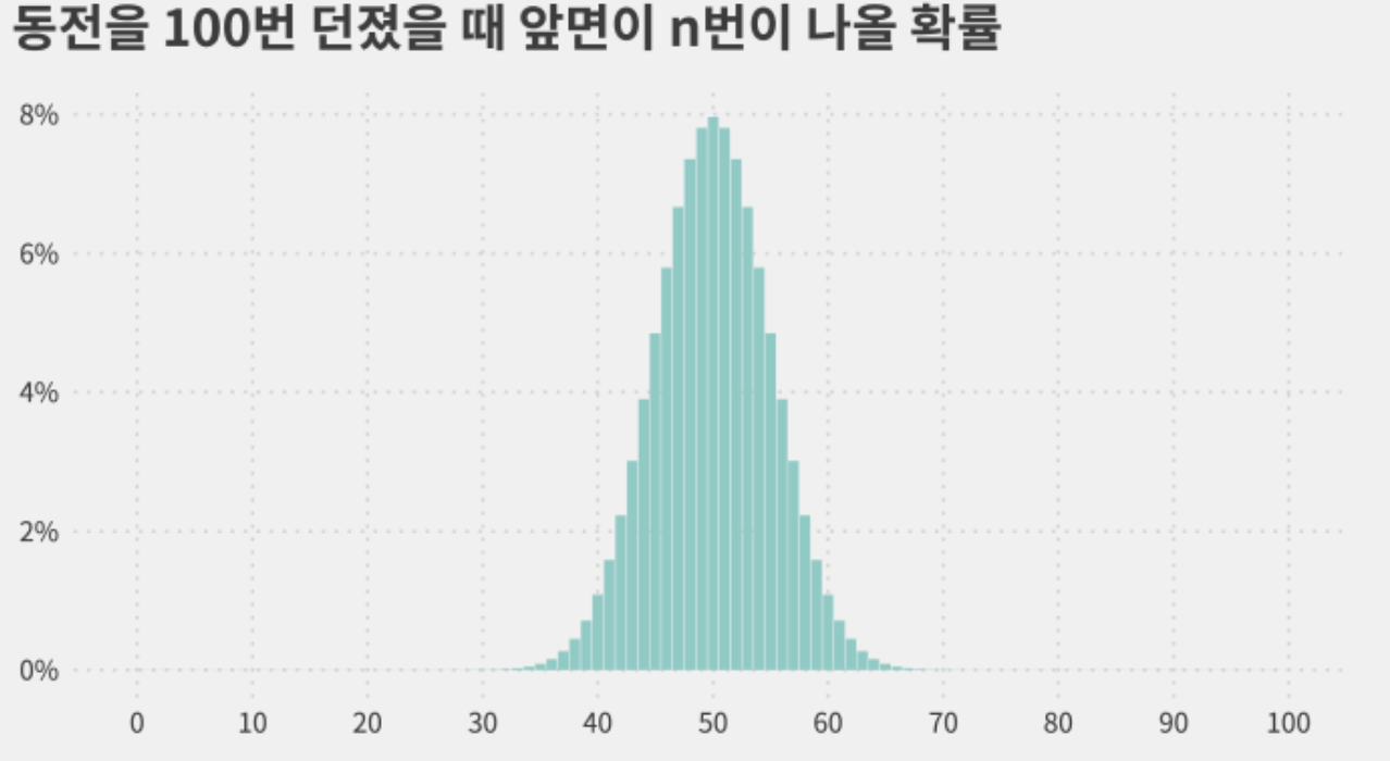 - 100번 던질 때, 앞면이 49~51회 나올 확률 : 23.6% (7.8% + 8% + 7.8%)