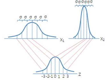 : 위 정규분포는 평균과 표준편차에 따라서, 모두 모양이 제각각이다보니, 특정 확률(ex.95%)를 규정하려면 정규분포마다 서로 다른 표준편차값이 설정될 것이다. → 때문에 정규분포에서 평균을 빼고, 표준편차로 나눠 ($Z$ = $(X - \mu)\over\sigma$) 평균이 0이고, 표준편차가 1인 ‘표준’정규분포로 변환하여 규격화해보자.