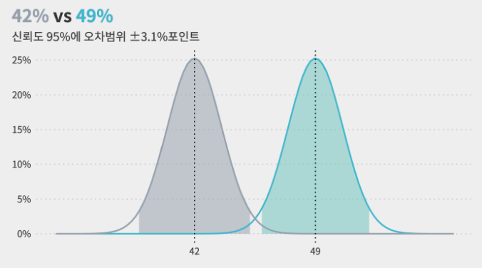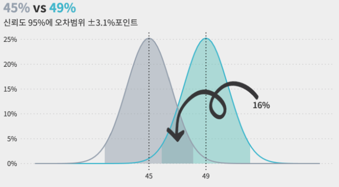 - 표본 오차 3.1%포인트일때, 부정평가 45%의 신뢰구간 = 41.9% ~ 48.1% $\therefore$ 두 응답의 오차범위가 서로 중첩되기에, 긍정평가가 더 높다는 설문결과는 95%신뢰수준을 만족하지 못하고 결과가 뒤집힐 수 있습니다.
